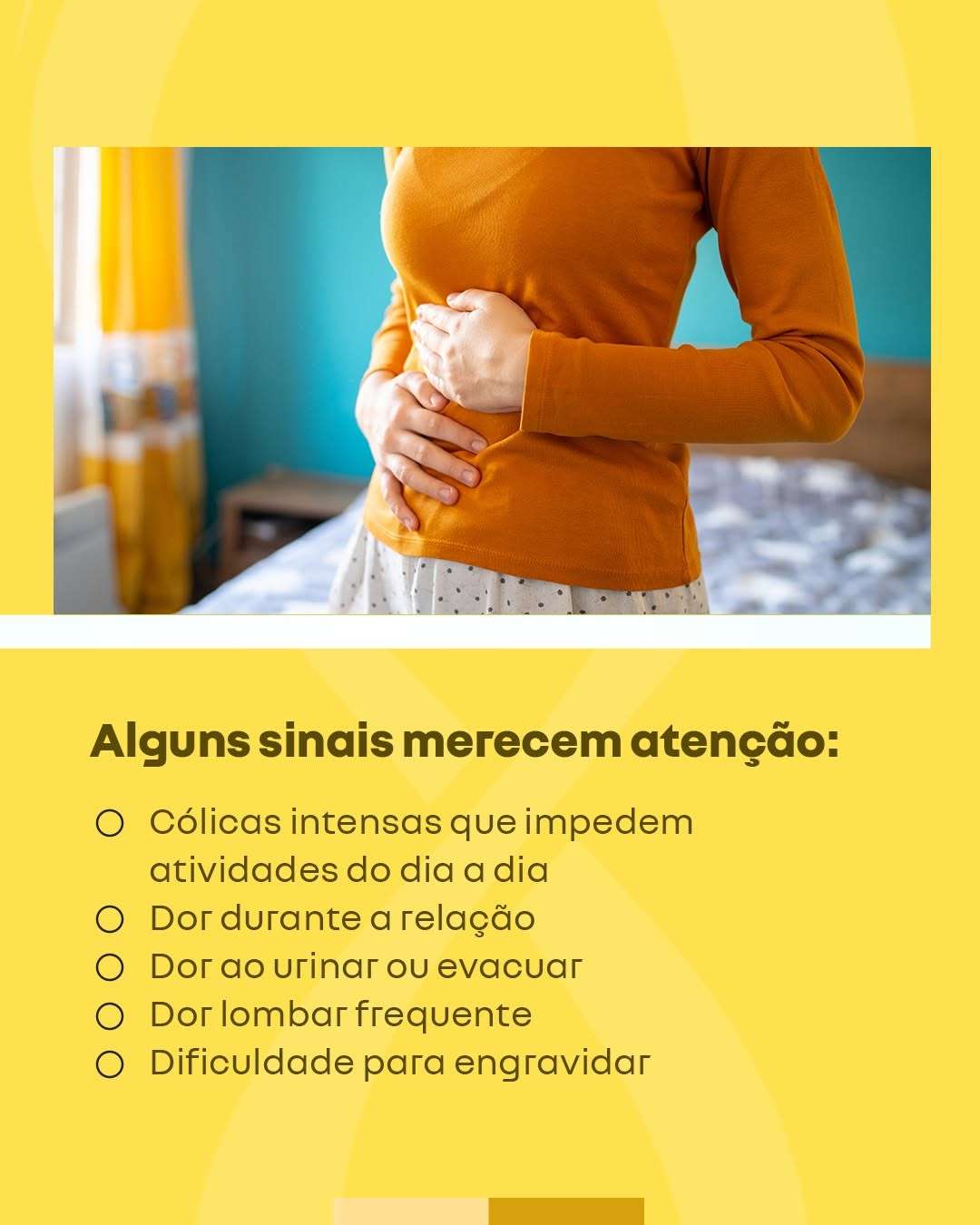 Veja o carrossel e se informe para reconhecer a endometriose e buscar ajuda no momento certo!